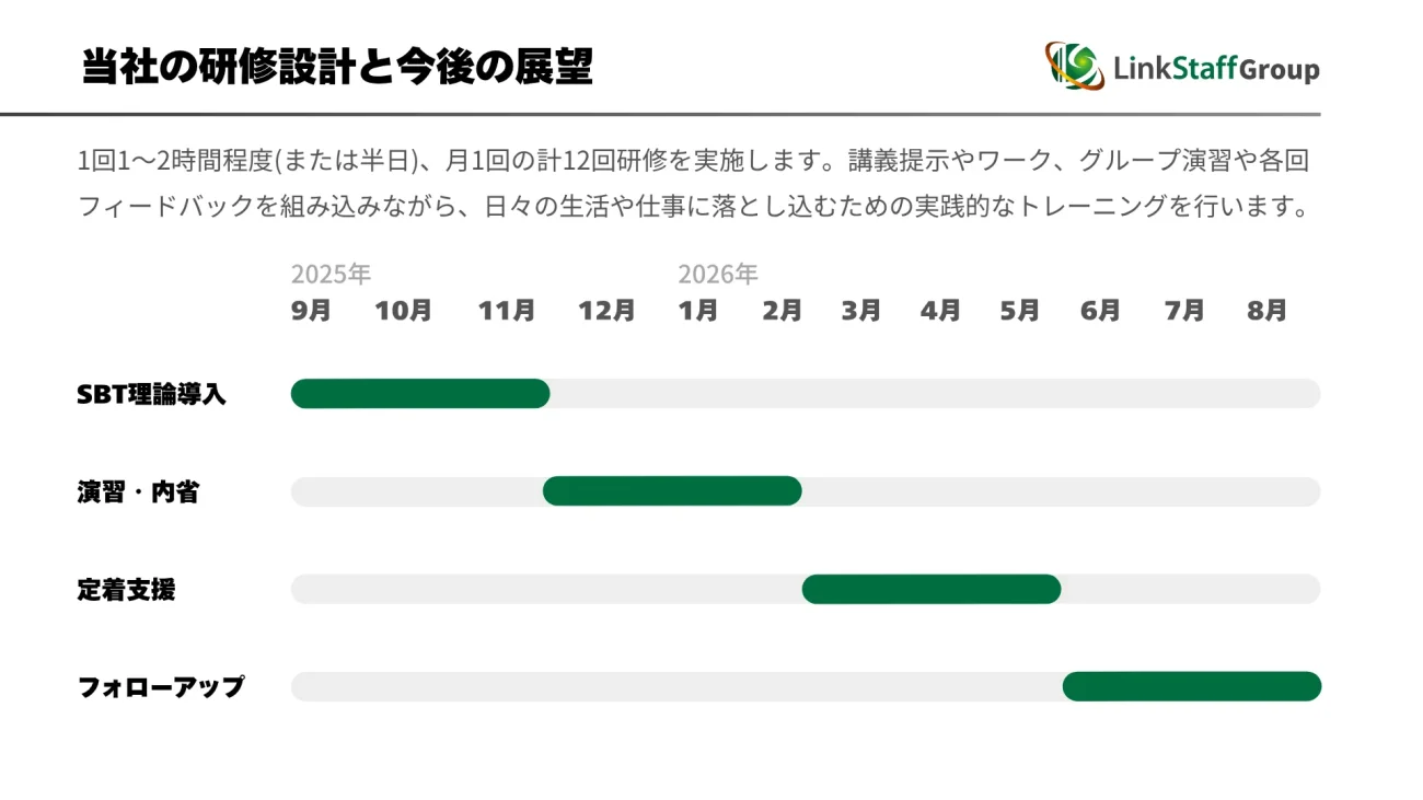 このように、単発研修ではなく継続型・体系型で進めることで、学びを定着させ、徐々に変化を育てていく設計としています。