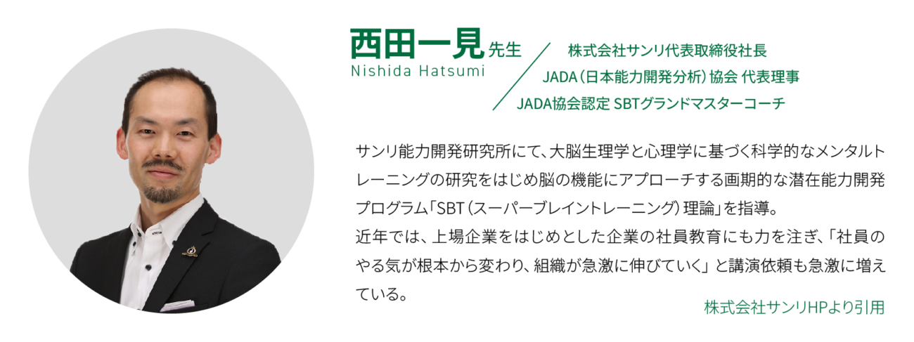西田一見先生は、サンリ能力開発研究所を拠点に、脳科学 × 心理学に基づく潜在能力開発プログラムを長年指導してこられた方です。