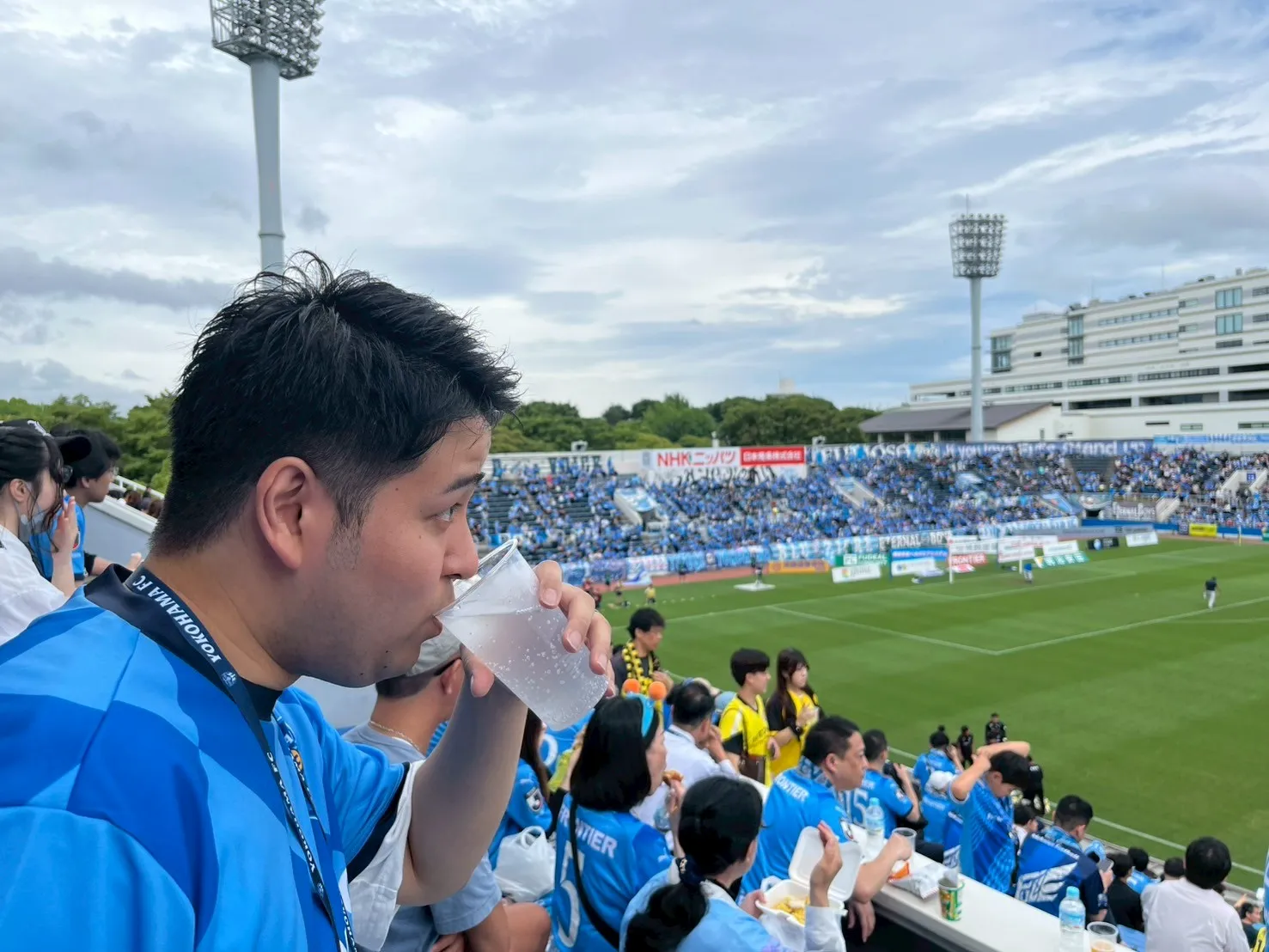 いざ試合が始まると、ピッチを真横から見られる最高の席で、フリードリンクのレモンサワーを飲みながら応援歌大合唱でした!
