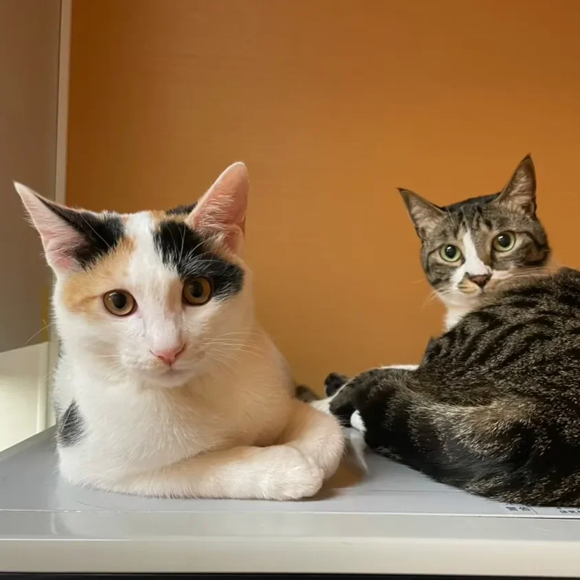 左側の三毛猫がネネちゃんで、右側のキジトラがポポちゃんです。